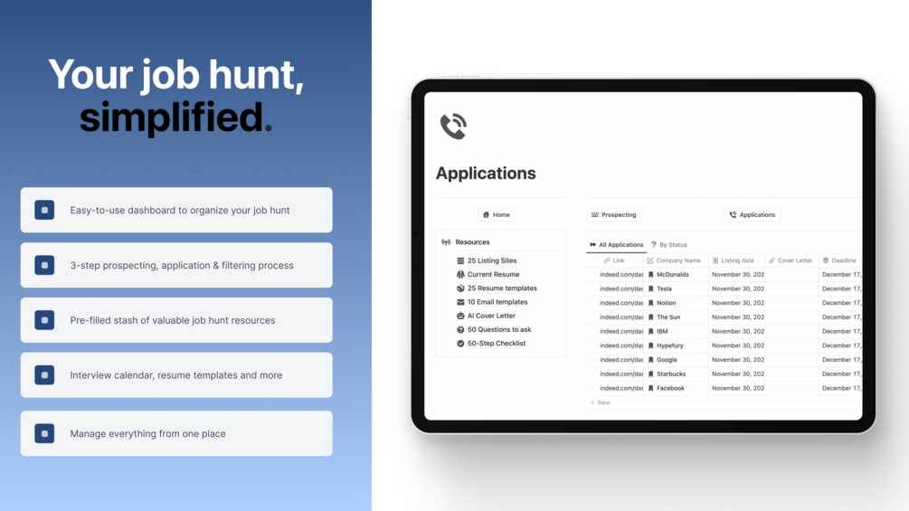 With a simple 3-step process, this template will help you organize and manage every aspect of your job hunt.