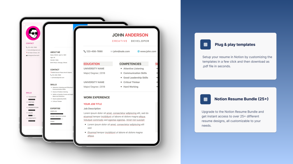 With the Notion Resume Template Pack, you get access to 3 customizable Notion resume templates. Fill out your info and download as .pdf file in a few clicks.