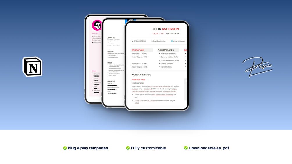 With the Notion Resume Template Pack, you get access to 3 customizable Notion resume templates. Fill out your info and download as .pdf file in a few clicks.