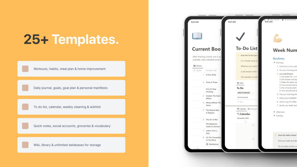A complete stoic Notion workspace and complete life operating system to manage your entire life, with more than 25+ templates inside, all designed to make your life easier.