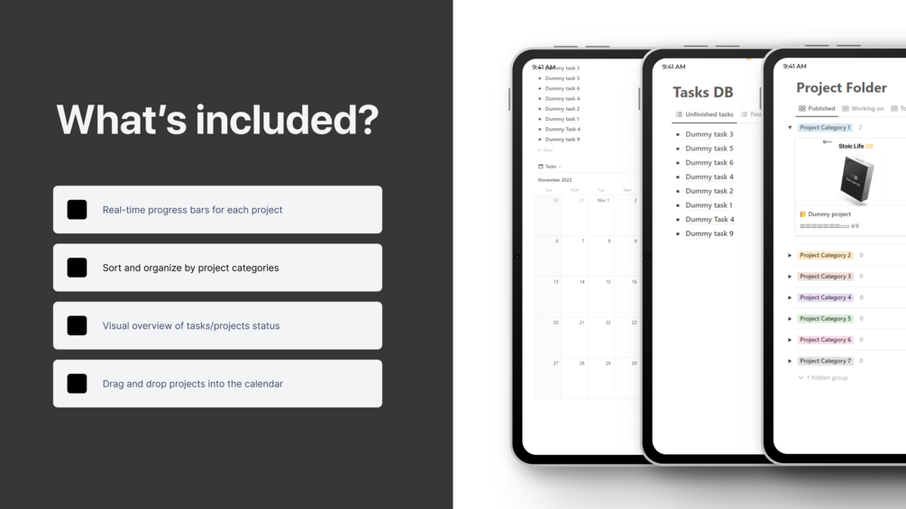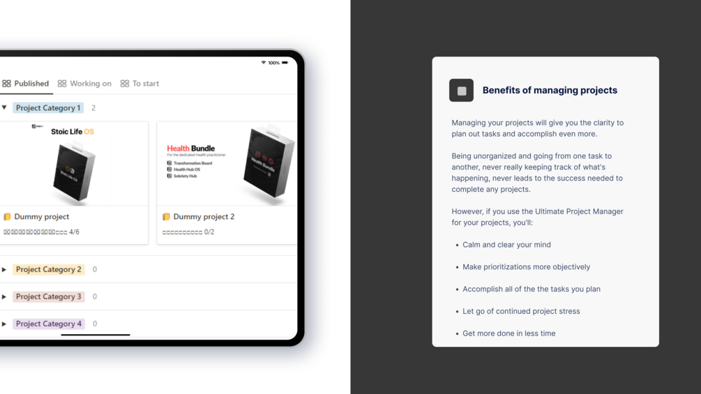 Improve your visual overview with this Notion template designed to let you handle projects with ease and tranquility.
